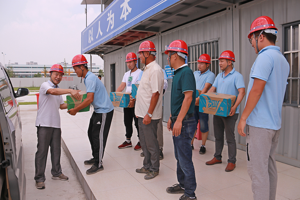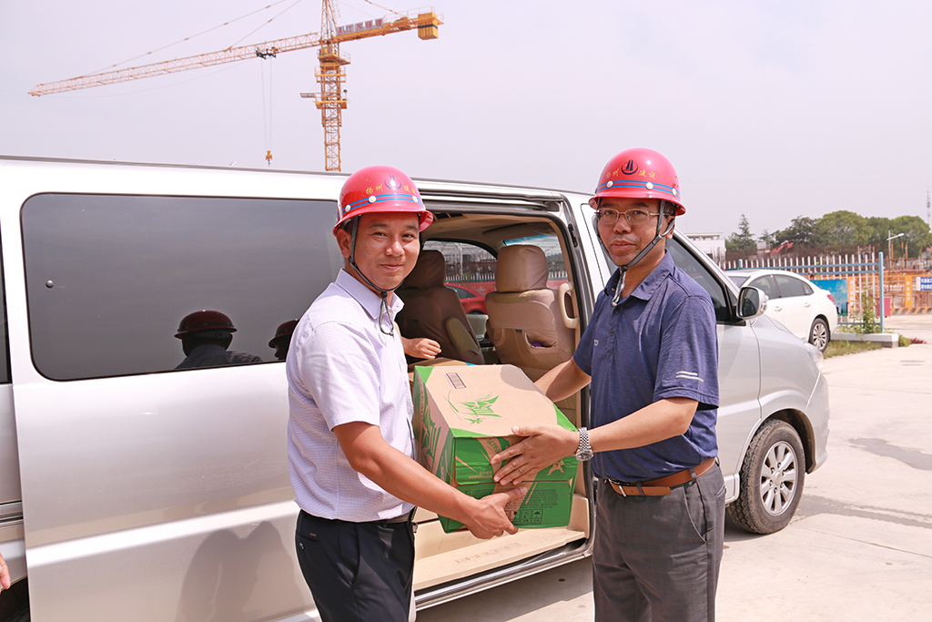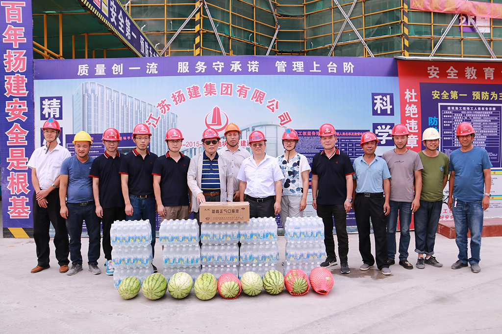 揚(yáng)建網(wǎng)訊 近來,連續(xù)的高溫天氣驕陽似火地烤驗著揚(yáng)州,也烤驗著我們堅守崗位的每一位員工。為切實(shí)做好項目一線防暑降溫工作,7月22日至26日,集團(tuán)領(lǐng)導(dǎo)及集團(tuán)工會、團(tuán)委、人力資源部、安全部、總師辦等相關(guān)部門負(fù)責(zé)人先后赴揚(yáng)子新苑D區(qū)安置房一期北組團(tuán)項目工程、警示教育基地、湯汪污水處理廠三期擴(kuò)工程、現(xiàn)代農(nóng)業(yè)科技創(chuàng)新中心產(chǎn)業(yè)化基地、廣沃電氣控制成套設(shè)備項目工程、公共衛(wèi)生中心、高郵人民醫(yī)院東區(qū)醫(yī)院(二期)、儀征2017-39#地塊、化學(xué)之光、沈飛601研究所項目、揚(yáng)州軟件園南區(qū)工程、華晟新型建筑科技、無錫食品城工程項目部等近20個項目部進(jìn)行夏季慰問,為冒著酷暑奮戰(zhàn)在一線的項目部管理人員、施工人員送去了飲料等消暑物品。
