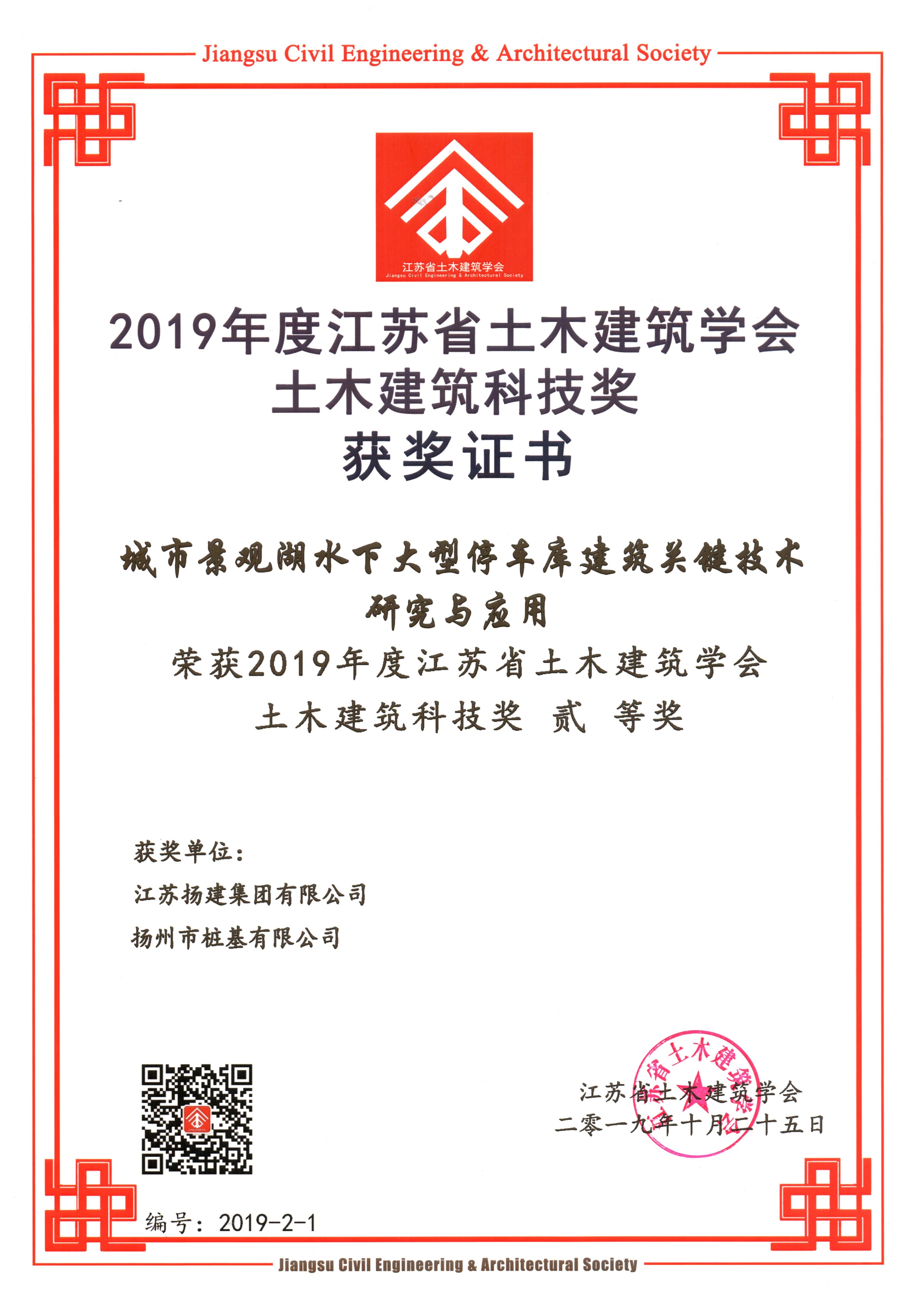 揚(yáng)建網(wǎng)訊 11月24日,江蘇省土木建筑學(xué)會(huì)于南京頒發(fā)了2019年度江蘇省土木建筑學(xué)會(huì)·土木建筑科技獎(jiǎng)。我集團(tuán)申報(bào)的科技成果《城市景觀湖水下大型停車庫建筑關(guān)鍵技術(shù)研究與應(yīng)用》榮獲二等獎(jiǎng)。