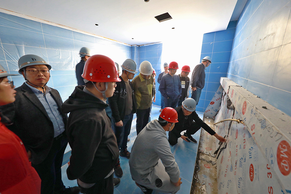 在觀摩過程中,項目部就施工現(xiàn)場各區(qū)域的亮點(如圖書館弧形鋁方管格柵接縫處理、墻與頂面、墻與柱面連接處的凹槽處理、教室入口處金屬裝飾板的排版及材質(zhì)選擇、南北大走廊金屬吊頂?shù)呐虐媾c連接、衛(wèi)生間墻地磚的排版及與衛(wèi)生潔具的配合施工、不銹鋼小便槽施工等)向觀摩人員作了一一介紹。大家在觀摩學習的過程當中,積極提問,邊聽邊拍照,認真記錄每一個好的經(jīng)驗和細部。