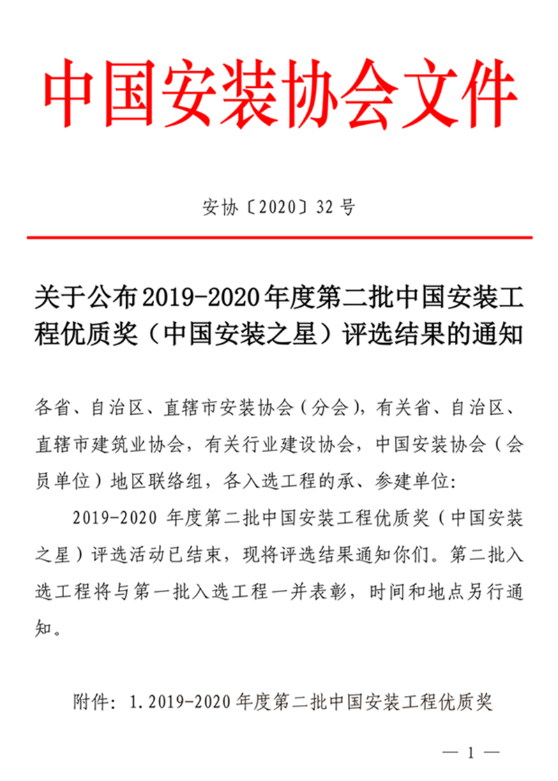 揚建網訊 日前,中國安裝協(xié)會公布了2019-2020年度第二批中國安裝工程優(yōu)質獎(中國安裝之星)評選結果,由集團機電分公司和環(huán)保公司共同申報的“江廣智慧城F地塊項目、K地塊項目工程施工(F地塊項目)安裝工程”和“TPI風機葉片生產廠房建設工程安裝工程”榮獲年度“中國安裝之星”稱號,這也是繼安裝產業(yè)板塊參建的新建萬福大橋工程和揚州中學教育集團樹人學校高中部榮獲“國家優(yōu)質工程獎”后,再一次捧回“國字號”質量獎項。