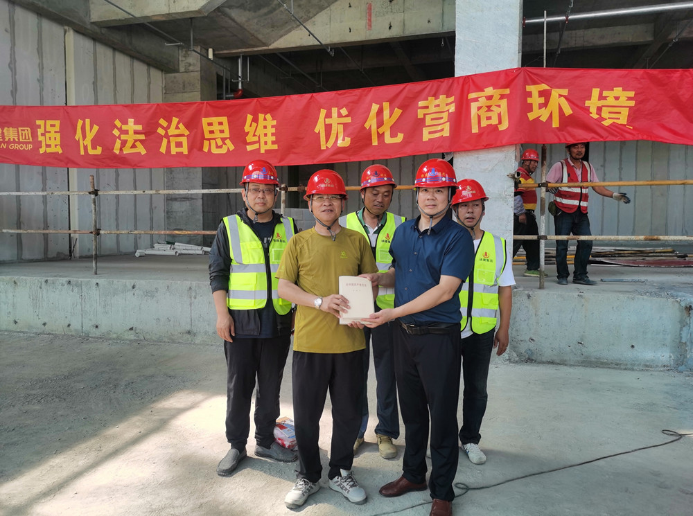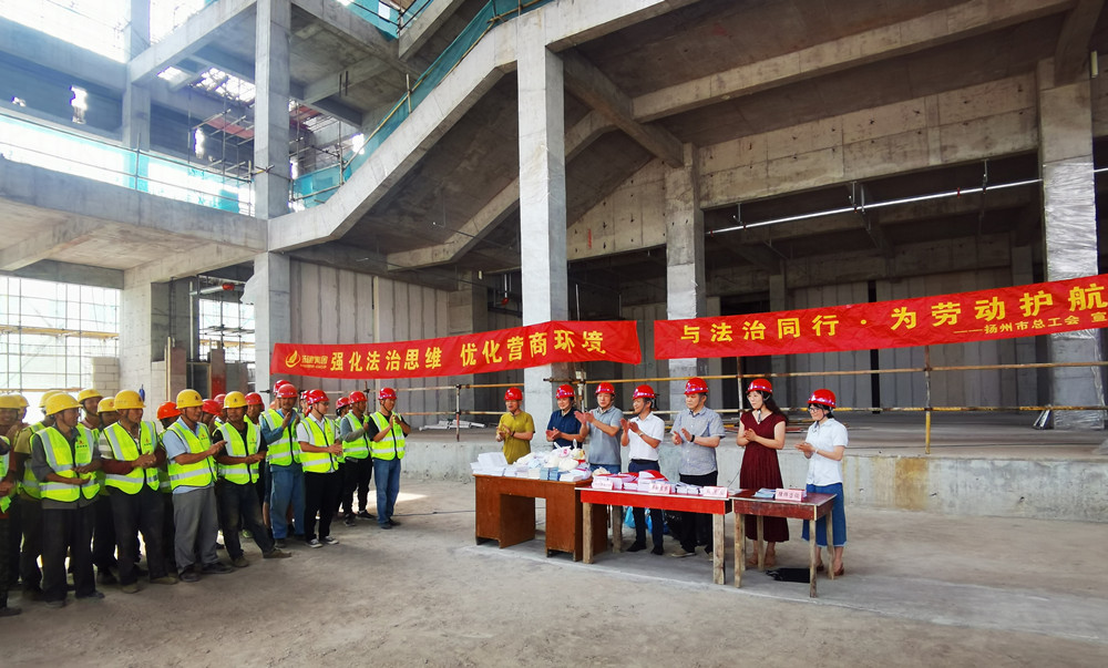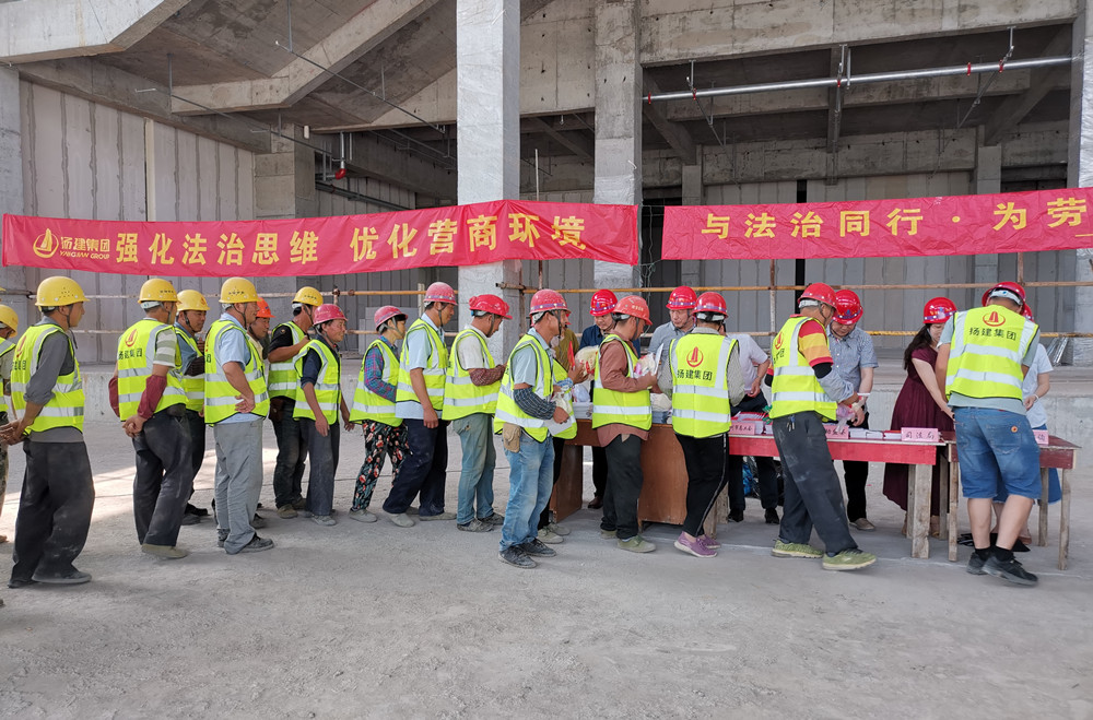 活動開始,市司法局領導詢問工人是否有法律方面的問題需要咨詢;并介紹了農民工兄弟維權合法渠道。接著,何平部長代表我集團對政府相關部門給予集團和農民工的關心關愛表示感謝,對辛勤奮斗在施工一線的工人兄弟表達了慰問?;顒又校邢嚓P部門領導給現(xiàn)場工人發(fā)放了《勞動法》《保障農民工工資支付條例》《工傷保險條例》《中國人民共和國民法典》等法律法規(guī)宣傳冊,并送去夏季防護用品,切實為工人謀實惠、辦實事,受到現(xiàn)場工人一致好評。