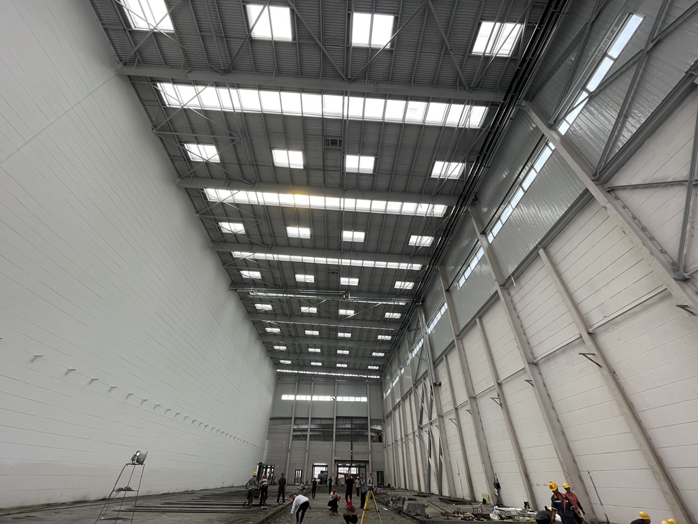 專業(yè)公司,齊心協(xié)力。6月7日下午15時,最后一塊鋼梁吊裝結(jié)束,這意味著立體倉庫主鋼架全面完成。但鋼結(jié)構(gòu)單位卻絲毫不敢松懈,等待他們的還有2400多平米的立體倉庫屋面,從檁條安裝到屋面底瓦、隔氣膜再到巖棉、柔性防水,他們都井然有序一一完成。水電安裝在不到20天的時間里將消防水主管、虹吸雨水管道系統(tǒng)、空氣采樣管、消防弱電管路、照明及排煙窗布線全部布置到位,累計安裝管路1200多米。立體庫內(nèi)最多達20臺各類起重登高機械,專業(yè)公司和總包一起,緊湊穿插時間和空間,日夜奮戰(zhàn)、分頭落實目標(biāo)。