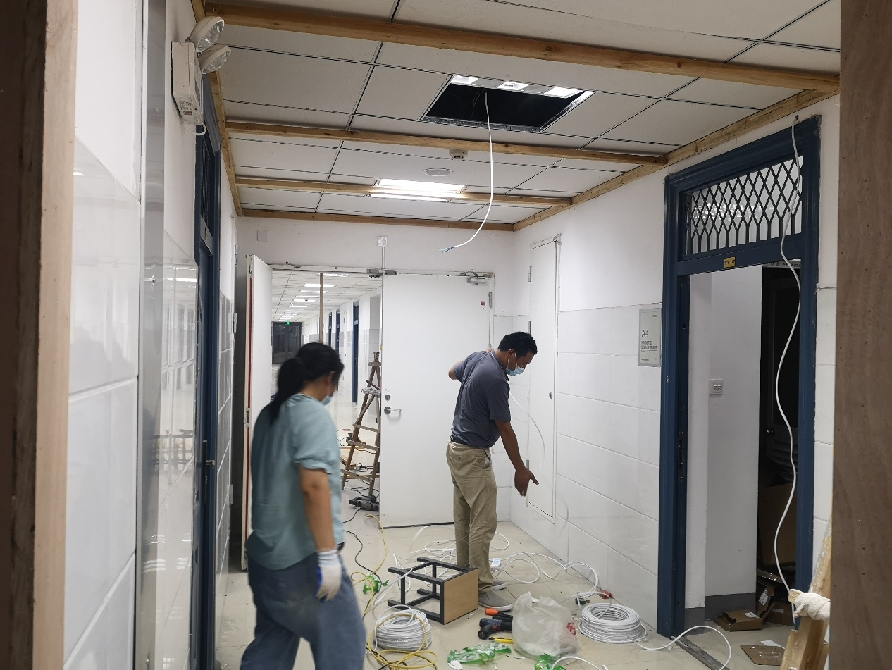 8月5日,一公司接到了揚(yáng)州經(jīng)濟(jì)技術(shù)開(kāi)發(fā)區(qū)關(guān)于江蘇旅游職業(yè)學(xué)院三幢宿舍樓隔離點(diǎn)改造工程的指令,并將任務(wù)分配到晶澳項(xiàng)目部,項(xiàng)目經(jīng)理涂劍超、項(xiàng)目工程師徐衎立刻火速奔赴施工現(xiàn)場(chǎng),投入到緊張的施工任務(wù)布置中。本次的施工任務(wù)主要是三幢宿舍樓潔凈區(qū)和隔離區(qū)之間的緩沖區(qū)分隔及封閉。由于本次新冠病毒為德?tīng)査兎N病毒,傳染性非常強(qiáng),為確保堅(jiān)守一線“天使們”的安全,避免醫(yī)護(hù)人員和病人交叉感染,項(xiàng)目部要求施工人員必須嚴(yán)格按照集中隔離醫(yī)學(xué)觀察點(diǎn)的設(shè)置標(biāo)準(zhǔn)進(jìn)行施工。受疫情影響,改造任務(wù)面臨材料調(diào)動(dòng)受阻,施工人員可選擇性小、施工時(shí)間緊迫等問(wèn)題,在項(xiàng)目管理一公司及開(kāi)發(fā)區(qū)的大力支持下,項(xiàng)目部施工人員通宵達(dá)旦,24小時(shí)內(nèi)保質(zhì)保量的完成了此項(xiàng)艱巨任務(wù)。另:8月6日晚19:00點(diǎn),晶澳項(xiàng)目部又接到了八里鎮(zhèn)政府“臨港賽夫孵化基地”核酸檢測(cè)點(diǎn)通道分割任務(wù),分割通道長(zhǎng)約1000米,項(xiàng)目部再次投入到緊張的施工中,在8月7日零點(diǎn)完成任務(wù)。