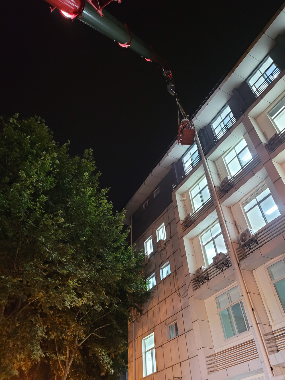 ——凌晨2點(diǎn),隨著時(shí)間的推移,為確保任務(wù)的完成,現(xiàn)場坐陣的卞總緊急增加了一臺(tái)25T的汽車吊車,大大加快了外墻排風(fēng)管道的安裝進(jìn)度;
