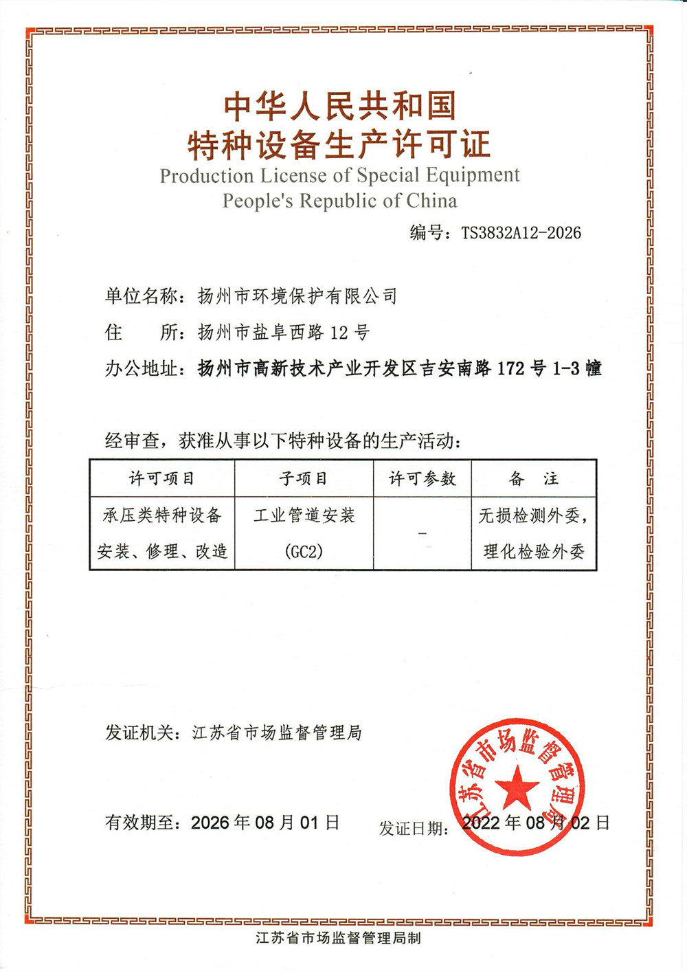 揚(yáng)建集團(tuán)環(huán)保公司取得承壓類管道特種設(shè)備生產(chǎn)許可證