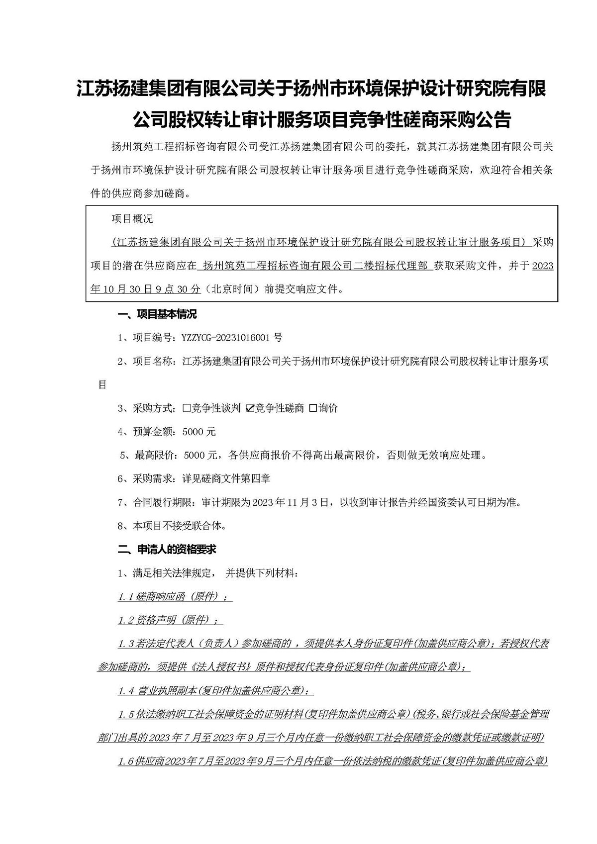 江蘇揚建集團有限公司關(guān)于揚州市環(huán)境保護(hù)設(shè)計研究院有限公司股權(quán)轉(zhuǎn)讓審計服務(wù)項目競爭性磋商采購公告