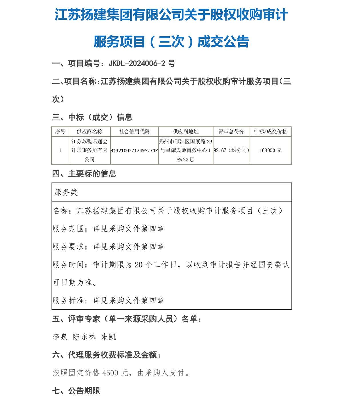 江蘇揚(yáng)建集團(tuán)有限公司關(guān)于股權(quán)收購(gòu)審計(jì)服務(wù)項(xiàng)目(三次)成交公告