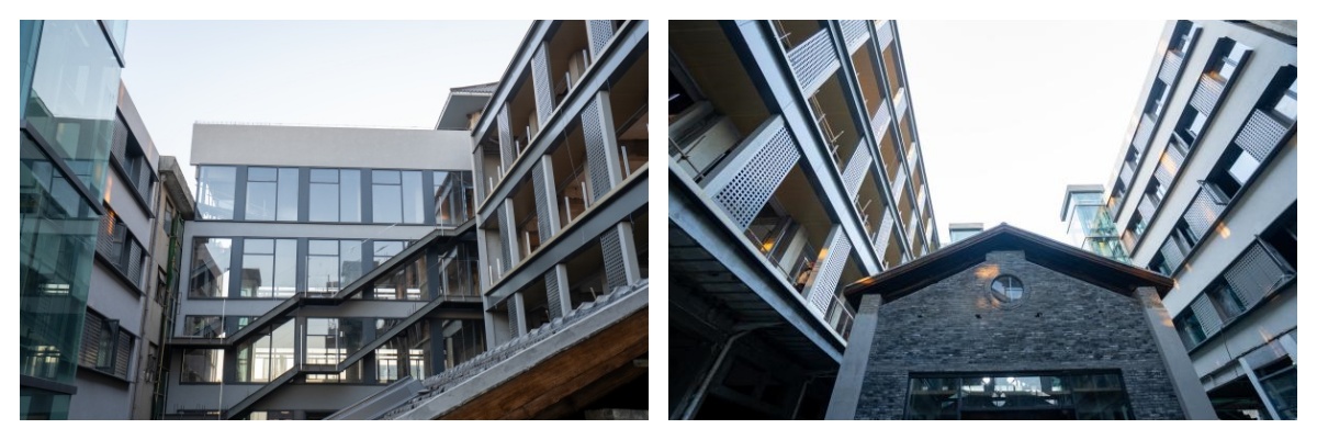 項(xiàng)目改造范圍涵蓋多棟建筑,總改造后建筑面積約5221.7平方米。在嚴(yán)格遵循文物保護(hù)與建筑安全規(guī)范的前提下,工程團(tuán)隊(duì)針對不同建筑類型制定了精細(xì)化施工方案。其中,對市級文保單位“同松參號”堅(jiān)持“修舊如舊”原則,采用木屋架不落架大修等傳統(tǒng)工藝,全力保留其歷史原貌。其余建筑則根據(jù)結(jié)構(gòu)狀況,分別采取拆除翻建、局部加固、結(jié)構(gòu)增強(qiáng)等措施。例如,對原有磚混結(jié)構(gòu)進(jìn)行鋼梁加固,對部分混凝土框架結(jié)構(gòu)實(shí)施擴(kuò)大截面、柱包鋼等加固技術(shù),并在新建部分中運(yùn)用鋼結(jié)構(gòu)與混凝土框架,確保建筑安全與功能實(shí)現(xiàn)之間的平衡。