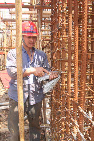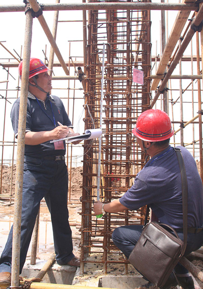 考核現(xiàn)場地劃分為A、B、C、D、E五個賽區(qū),每個賽區(qū)的企業(yè)考評專家、考評監(jiān)督員和考評員根據(jù)技師考核標(biāo)準(zhǔn)負(fù)責(zé)對賽區(qū)內(nèi)的8名選手進(jìn)行現(xiàn)場考評。選手按照考核項(xiàng)目要求,在規(guī)定的時間內(nèi)依據(jù)現(xiàn)場提供的施工圖紙,完成框架柱箍筋數(shù)量計算、箍筋綁扎、安放保護(hù)層、清理現(xiàn)場等操作。賽前,企業(yè)考評專家做了技術(shù)和安全交底,每位選手都將施工圖紙內(nèi)容牢記于心,隨著裁判長的一聲令下,所有選手爭相步入指定位置,迅速投入到了競賽中:量間距、套箍筋、鋼筋綁扎、安放保護(hù)層……,每位選手都嫻熟地運(yùn)用著手中的工具搶時間、拼質(zhì)量,顯敏捷身手。競賽過程中,雖然頭頂烈日,但絲毫沒有影響到選手的發(fā)揮,整個競賽現(xiàn)場秩序井然。